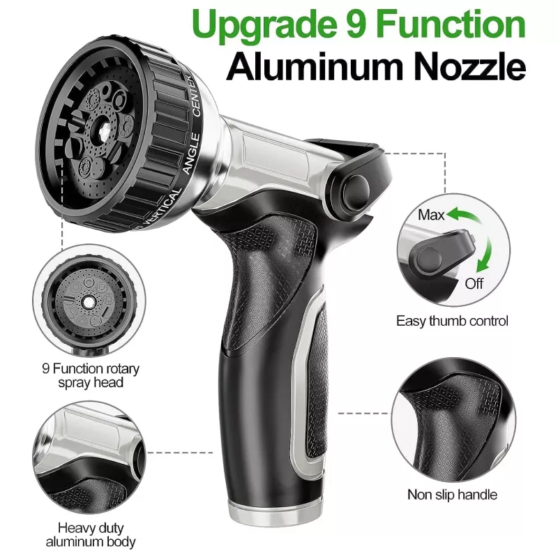 • Upgraded Aluminum Nozzle: The sturdy aluminum nozzle features 9 different spray patterns, allowing you to easily adjust the water flow for various tasks, whether you’re watering delicate plants or washing tough dirt off your vehicle.