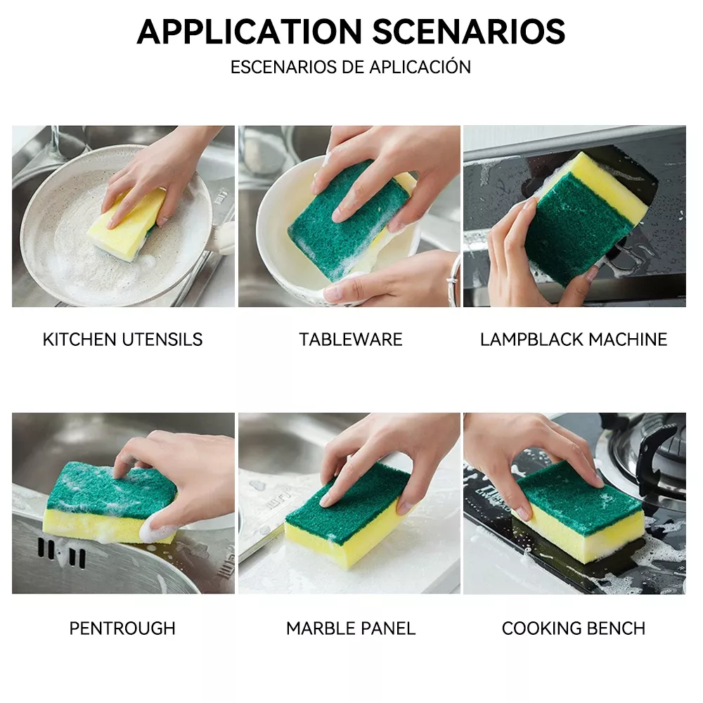 These sponges are not your average kitchen cleaning tool. Their thoughtful design ensures both cleaning ease and longevity. The **soft yellow side** effectively absorbs water and works gently on dishes, while the **green scrubbing side** is designed to break down grease and food particles without scratching or damaging surfaces. From washing dinnerware to cleaning tough, oily surfaces, this sponge is a must-have for all your kitchen needs.